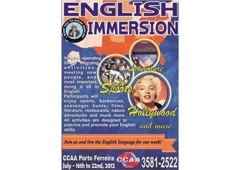 O CCAA – Porto Ferreira está com inscrições abertas para a primeira semana de imersão em inglês. O “ENGLISH IMMERSION” ocorrerá entre os dias 16 e 21 de julho e é inédito na região.