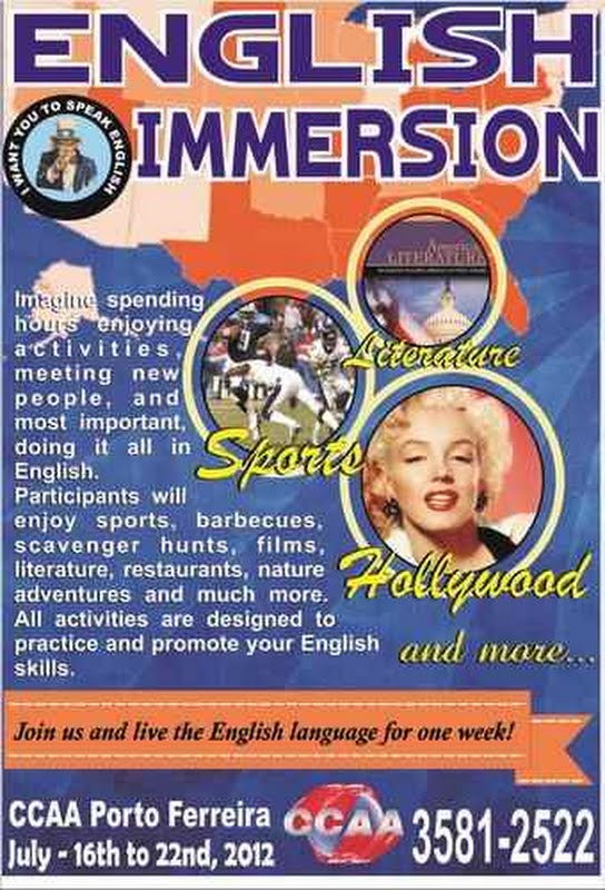 O CCAA – Porto Ferreira está com inscrições abertas para a primeira semana de imersão em inglês. O “ENGLISH IMMERSION” ocorrerá entre os dias 16 e 21 de julho e é inédito na região.
