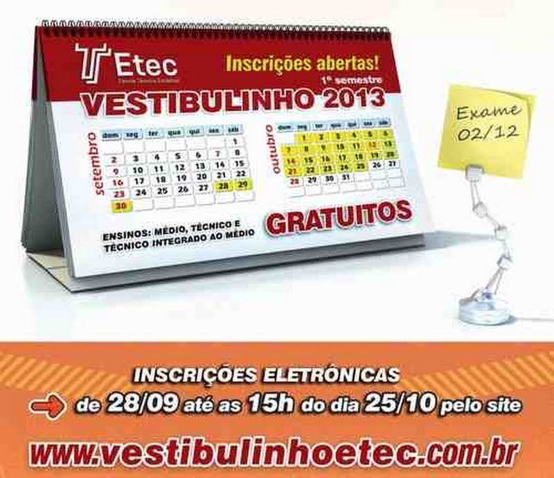 No período de 28 de setembro às 15 horas do dia 25 de outubro estarão abertas as inscrições para o Vestibulinho do 1º semestre de 2013 para os Cursos da Etec Professor Jadyr Salles – Centro Paula Souza.
