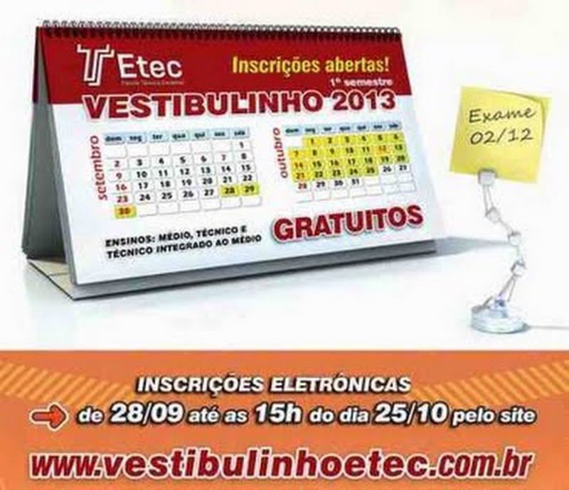 O Centro Paula Souza recebe até amanhã, quinta-feira (25) as inscrições para o Vestibulinho das Escolas Técnicas Estaduais (Etecs) para o 1º semestre de 2013. O exame será no dia 2 de dezembro, às 13h30.