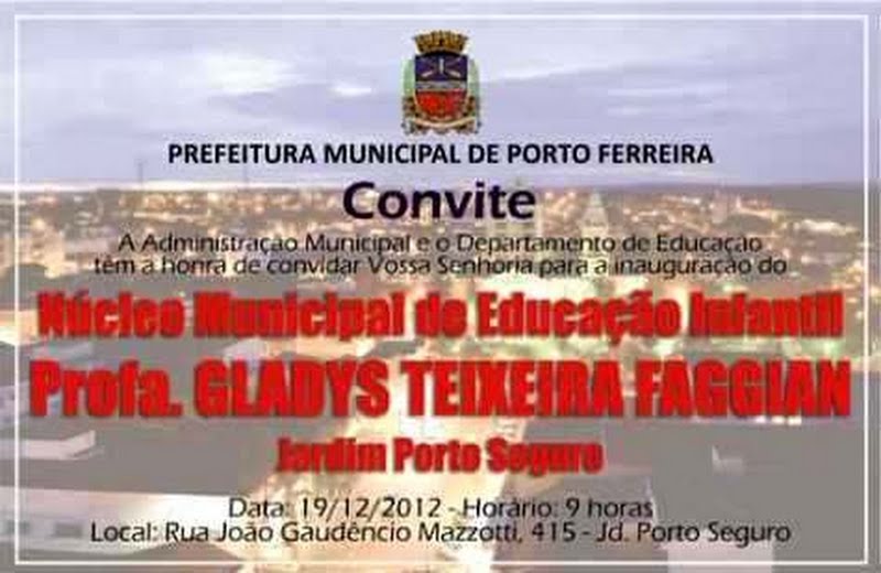 A Prefeitura do Município de Porto Ferreira e o Departamento de Educação inauguram nesta quarta-feira (19), às 9 horas, o Núcleo Municipal de Educação Infantil Profª Gladys Teixeira Faggiam, localizado na rua João Gaudêncio Mazzotti, 415, Jardim Porto Seguro.