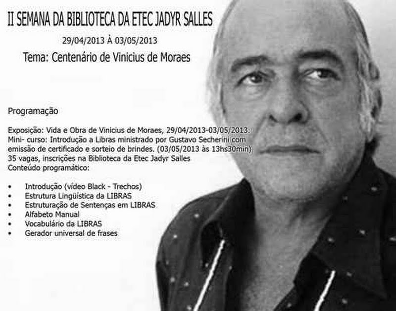 A II Semana da Biblioteca da Etec Jadyr Salles, tem como tema o Centenário de Vinícius de Moraes, com exposição sobre sua vida e obra além de um minicurso de introdução a libras com emissão de certificado.