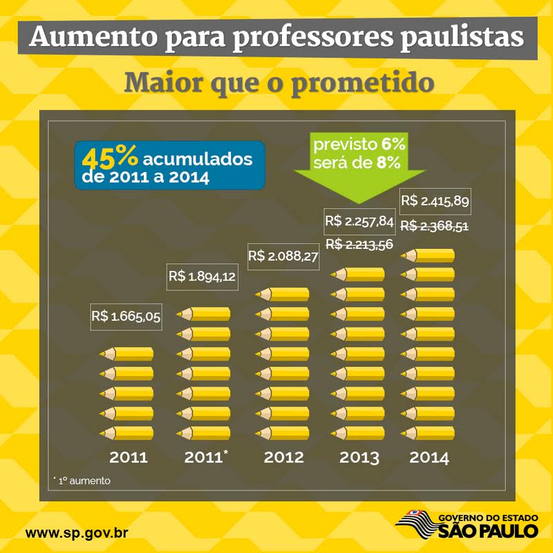 O aumento salarial dos professores da rede estadual de ensino entre 2011 e 2014 vai chegar a 45,1%. O salário de docentes do 6º ao 9º ano do Ensino Fundamental e Ensino Médio, que era de R$ 1.665,05, chegará a R$ 2.415,89 com carga horária de 40 horas semanais.