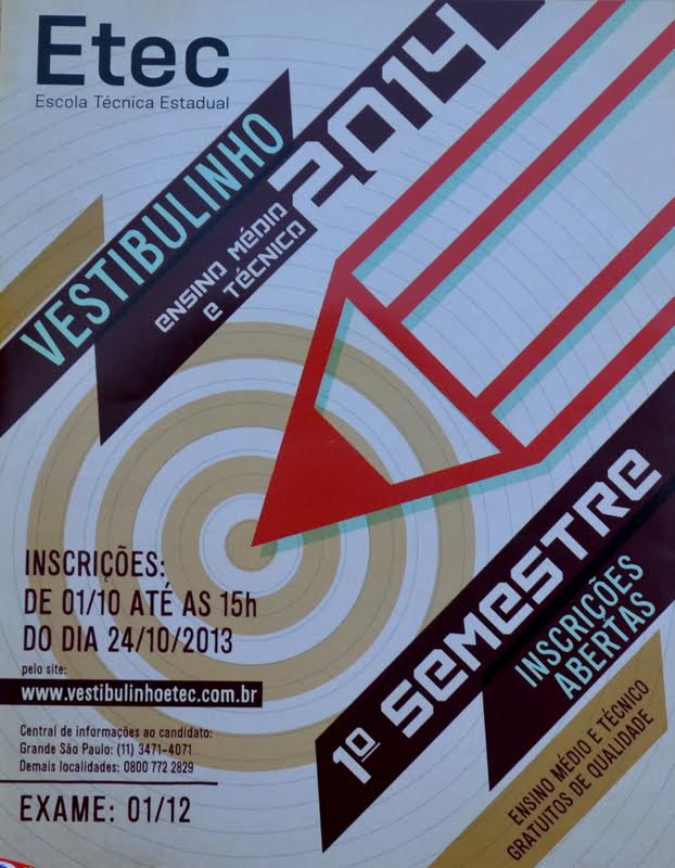 O Vestibulinho das Etecs (Escolas Técnicas Estaduais) está com inscrições abertas até as 15h de 24 de outubro. Os interessados devem se inscrever pela internet ( http://www.vestibulinhoetec.com.br/home/ ) . A taxa é de R$ 25, e a confirmação da inscrição será enviada por e-mail até 10 dias após o pagamento. A prova será realizada no dia 1º de dezembro.