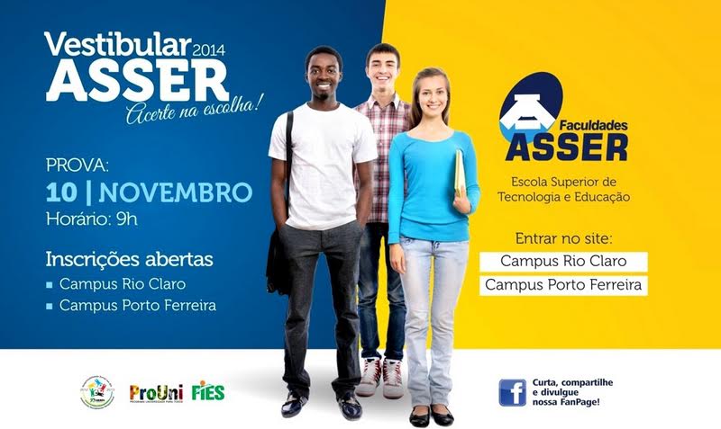 Estão abertas as inscrições para o vestibular da Escola de Tecnologia e Educação de Porto Ferreira – Asser-PF, cujas provas acontecem no dia 10 de Novembro de 2013.