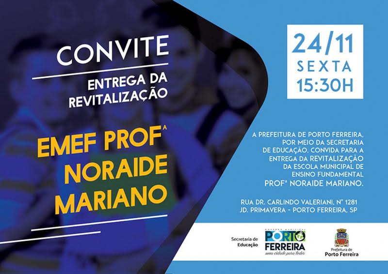 Nesta sexta-feira (24/11), às 15h30, está marcada a cerimônia de entrega das obras de revitalização da Escola Municipal de Ensino Fundamental (Emef) Professora Noraide Mariano, localizada no Jardim Primavera.