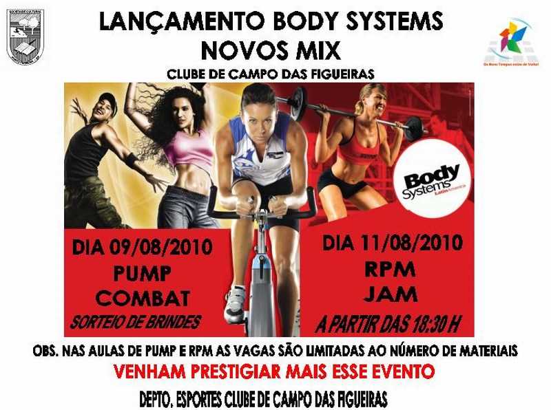 Hoje, 09, a academia do Clube de Campo das Figueiras dará inicio ao lançamento dos novos Mix Body Systems, com sorteio de vários brindes aos participantes. Às 18h30, será a vez da aula de PUMP com a professora Altamira Rodrigues. Na sequencia, às 17h30, ela estréia o novo Mix das aulas de Combat.