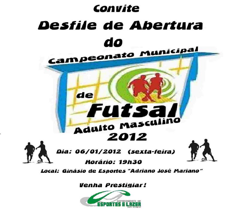 A Prefeitura Municipal de Porto Ferreira através do Departamento Municipal de Esporte e Lazer convida toda a população ferreirense para prestigiarem o Desfile de Abertura do Campeonato Municipal de Futsal Adulto Masculino denominado “Davilson Guedes dos Santos”.