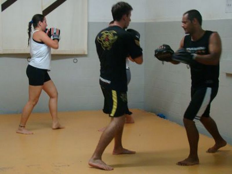 No combate os lutadores utilizam equipamentos de proteção como protetor de tórax, canela, luvas e protetor bucal.