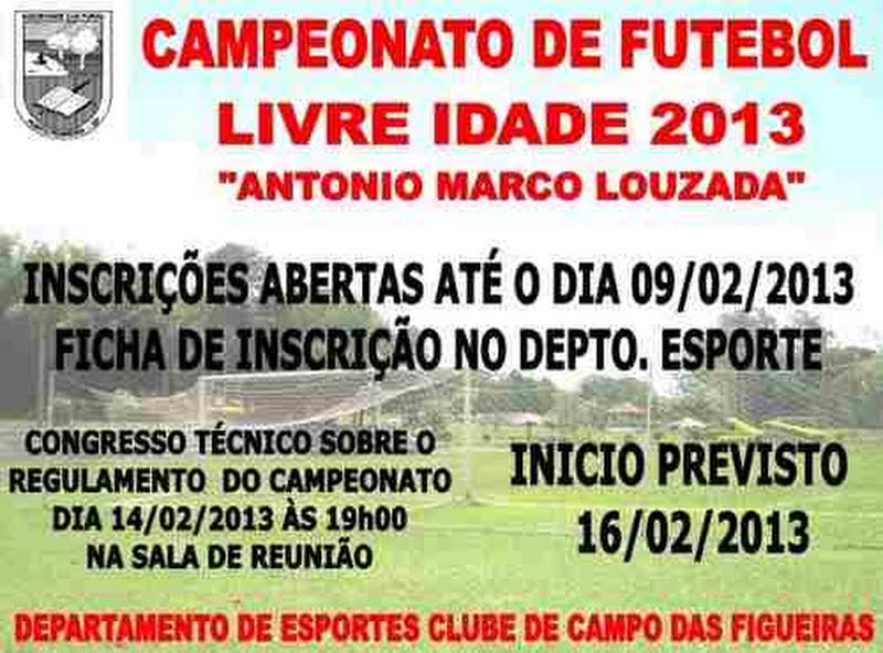 Estão abertas as inscrições para o Campeonato de Futebol Livre Idade 2013 “Antônio Marco Louzada” no Clube de Campo das Figueiras.