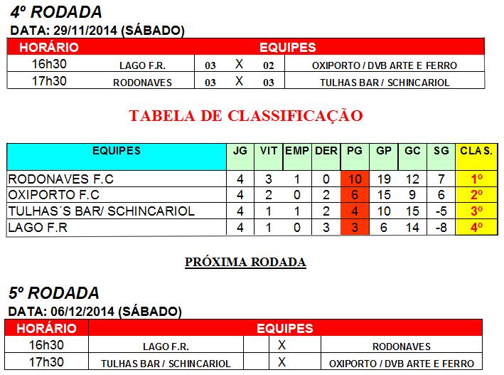 A quarta rodada da II Copa Master 30 anos de Futebol Society do Clube de Campo das Figueiras teve jogos bem equilibrados no último final de semana, registrando o primeiro empate do líder da competição. A equipe da Rodonaves, após três vitórias, empatou em 3 a 3 com o Tulha Bar/Schincariol.