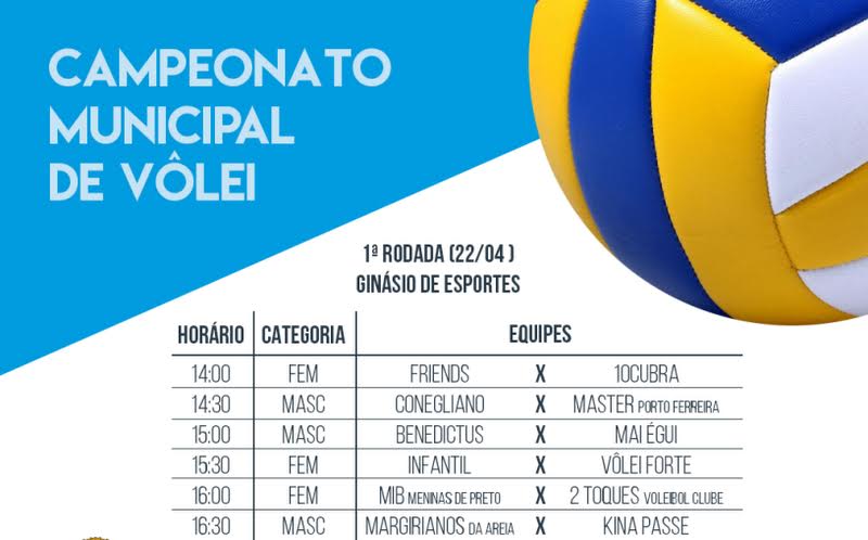 A Secretaria de Esportes e Lazer da Prefeitura de Porto Ferreira divulgou os jogos da primeira rodada do Campeonato Municipal de Voleibol, que tem início no sábado (22/04). Serão seis jogos ao todo, nas categorias masculina e feminina. No sábado seguinte (29/04) também terá início o Campeonato Municipal de Basquetebol.