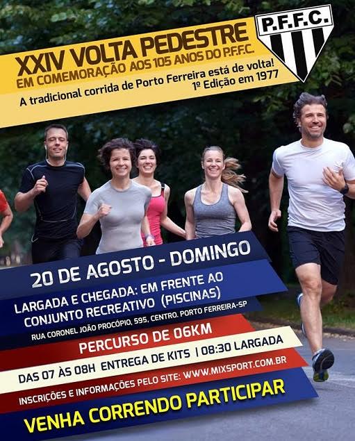 Tradicional corrida de Porto Ferreira está de volta. Acontece amanhã, 20 de Agosto de 2017. A saída será em frente ao conjunto recreativo do Porto Ferreira F.C., localizado na rua Coronel João Procópio nº 595, Centro de Porto Ferreira-SP. O percurso será de 6 Km, com largada às 8h30.