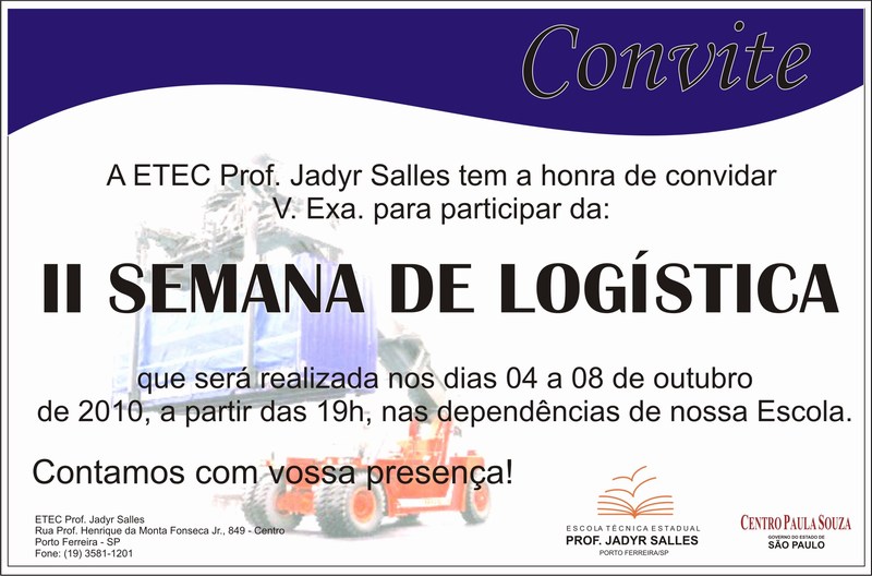 A II Semana de Logística será realizada nos dias 04 a 08 de Outubro, a partir das 19 horas, nas dependências da ETEC Prof. Jadyr Salles, localizada à Av. Prof. Henrique da Motta Fonseca Júnior, 849 – Centro.