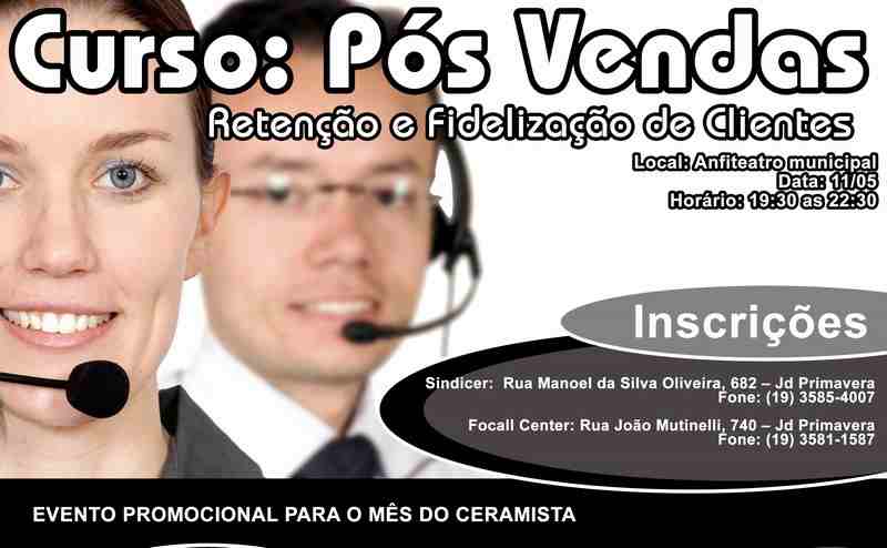 No próximo dia 11 de maio, no período das 19:30 às 23:30, será realizado no Teatro Isaltino Casemiro (antiga área da Fepasa), o Curso Pós Vendas, destinado aos empresários interessados na retenção e fidelização de clientes.