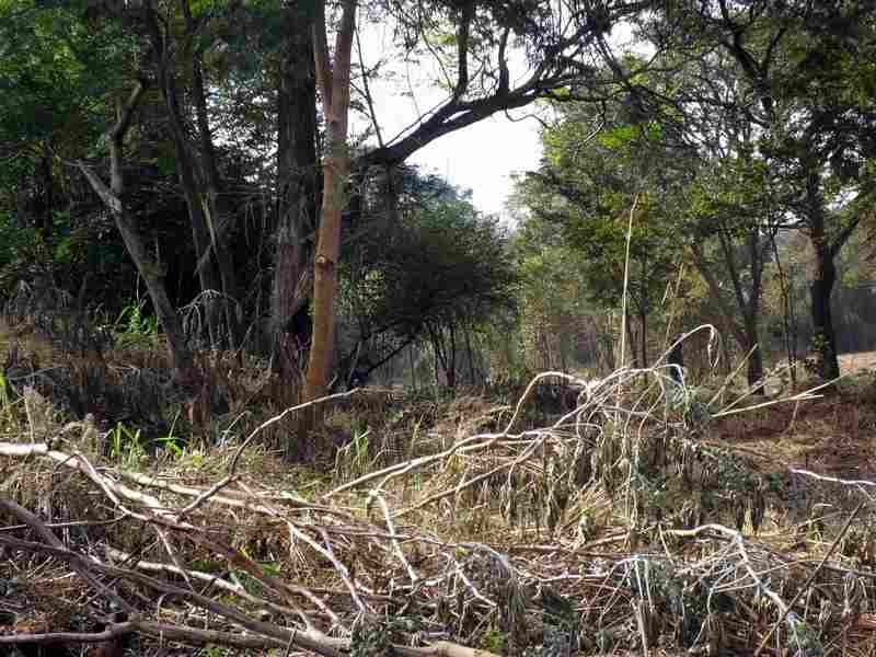 Há uma clareira no meio da vegetação da área, e alguns barracos precários já foram construídos, havendo movimentação de pessoas pelo local.