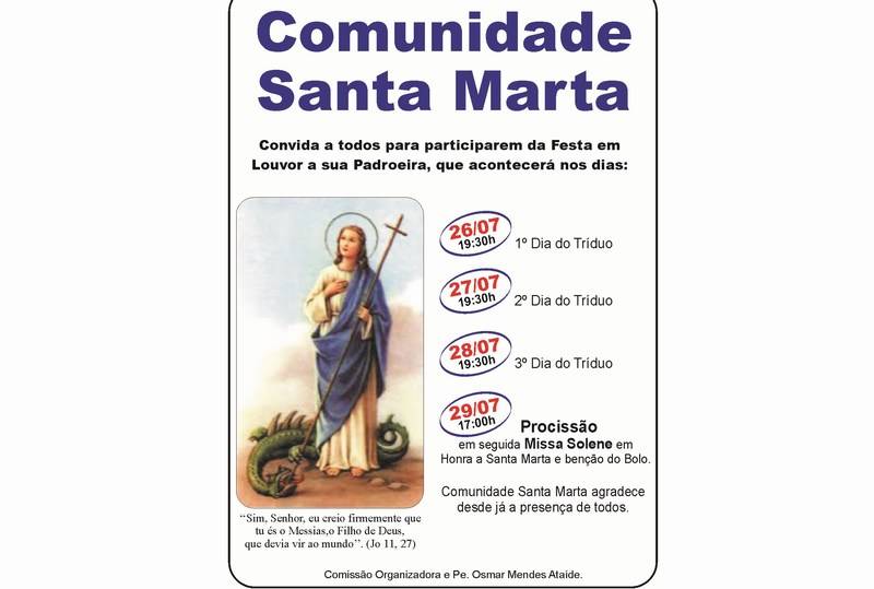 A Comunidade Católica Santa Marta, pertencente a Paróquia Nossa Senhora Aparecida, estará comemorando o dia de Santa Marta com Festas em Louvor a sua Padroeira entre 26 e 29 de julho.