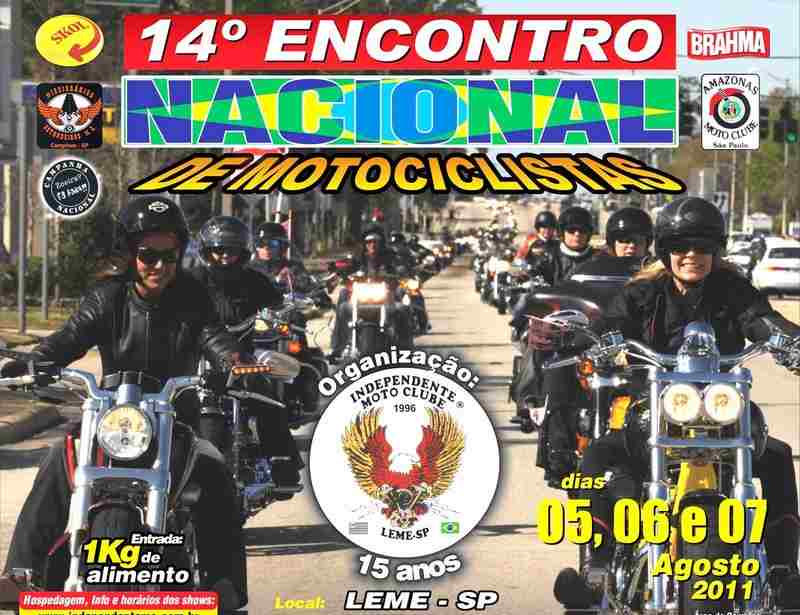 Acontece no próximo fim de semana, dias 5, 6 e 7 de agosto, no Recinto de Exposições “Orlando Arraes Serôdio” (Recinto da Fapil), o 14º Encontro Nacional de Motociclistas, promovido pelo Independente Moto Clube de Leme. O evento contará com a apresentação de várias bandas de rock da região, praça de alimentação, venda e exposição de peças, acessórios e equipamentos para motos, além de área de camping coberta para mais de três mil pessoas.