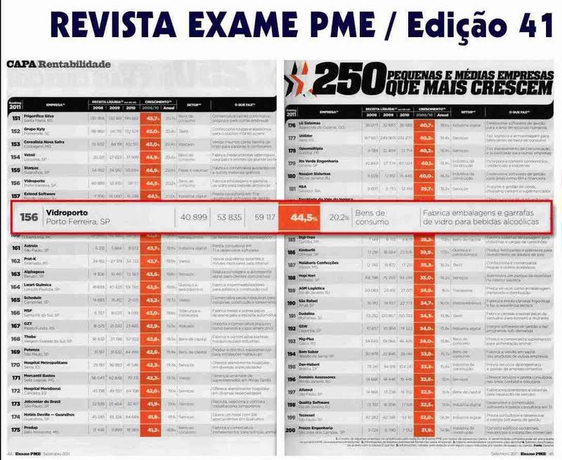 Considerando somente as empresas que apresentam Receita Líquida acima de R$ 40 milhões por ano, a Vidroporto ficaria entre as 60 empresas que mais crescem no Brasil.