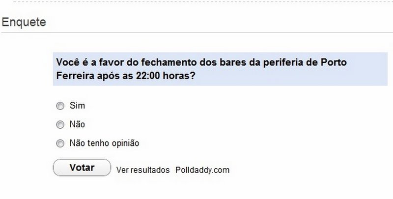 Foi encerrada hoje (22 10) a enquete intitulada “Você é a favor do fechamento dos bares da periferia de Porto Ferreira após as 22 horas?. As opções de resposta foram: Sim, Não e Não tenho opinião.