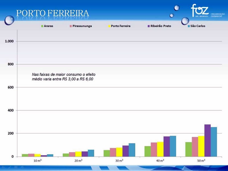“É importante ressaltar que a nova tarifa, em vigor em dezembro, estará dentro da média de cidades da região, como Araras e Pirassununga, e abaixo dos valores cobrados por São Carlos e Ribeirão Preto. Na prática haverá uma variação para as faixas de 10 a 20 metros cúbicos, onde está a maioria da população, em torno de aproximadamente R$ 3,26 a R$ 6,00, respectivamente” afirma a Diretora da Foz em Porto Ferreira, Paula Violante.