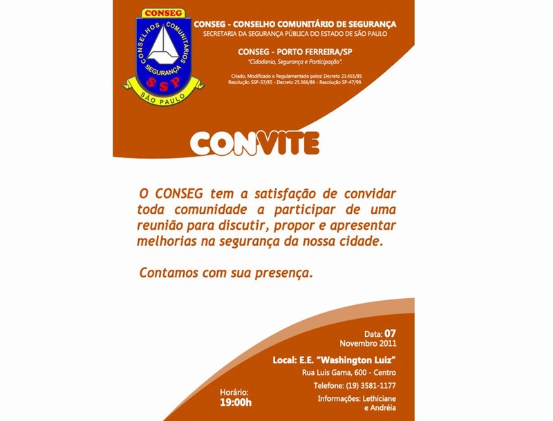 A Policia Militar da cidade de Porto Ferreira convida todos os moradores da Àrea Central da cidade para uma reunião que será realizada na próxima segunda-feira (07/11), às 19:30 hs, na Escola Washington Luiz, localizada na Rua Luiz Gama, para tratar de assuntos relativos à segurança na Região Central da cidade.