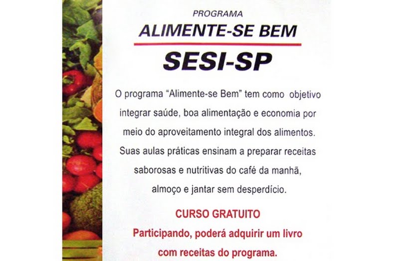 Em atendimento à solicitação da Prefeitura Municipal, o Sesi (Serviço Social da Indústria) oferecerá gratuitamente em Descalvado, do próximo dia 28 de fevereiro ao próximo dia 22 de março, o curso Alimente-se Bem, que ensina a preparar diversas receitas aproveitando totalmente os alimentos, inclusive cascas, talos e folhas de frutas, legumes e verduras. O objetivo é estimular as famílias a evitar o desperdício e a reduzir despesas com alimentação.