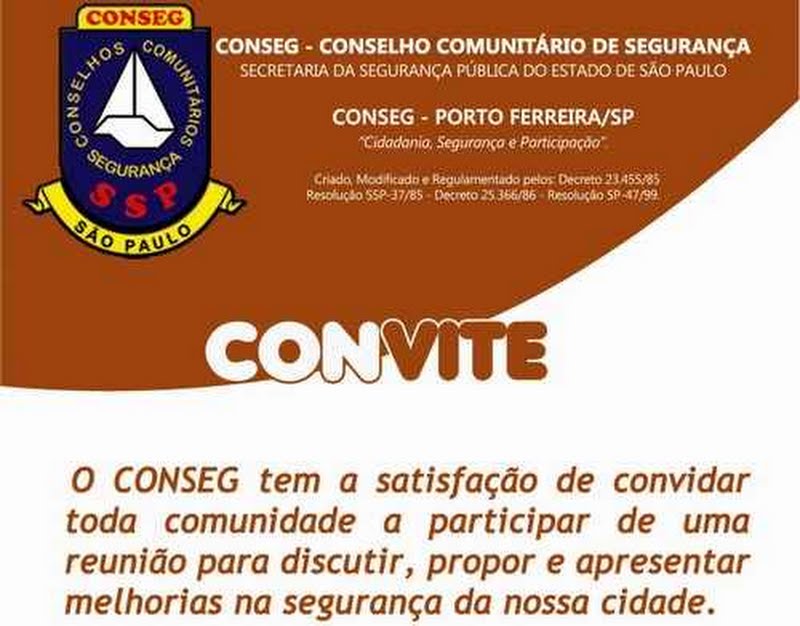 O Conselho Comunitário de Segurança de Porto Ferreira – Conseg está convidando toda a comunidade a participar de uma reunião para discutir, propor e apresentar melhorias na segurança de nossa cidade.