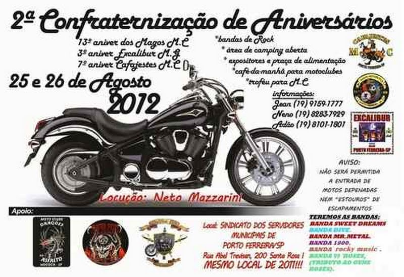 A 2ª Confraternização de Aniversários dos moto clubes e moto grupo de Porto Ferreira acontece nos dias 25 e 26 de Agosto de 2012 . O evento será realizado em área do Sindicato dos Servidores Públicos de Porto Ferreira, localizado na rua Abel Trevisan, 200, Santa Rosa I, com início no sábado (25), a partir das 13h00, e no domingo, a partir das 11h00, quando será celebrada uma missa pelo Padre Luciano Alves, da Paróquia Nossa Senhora da Assunção.