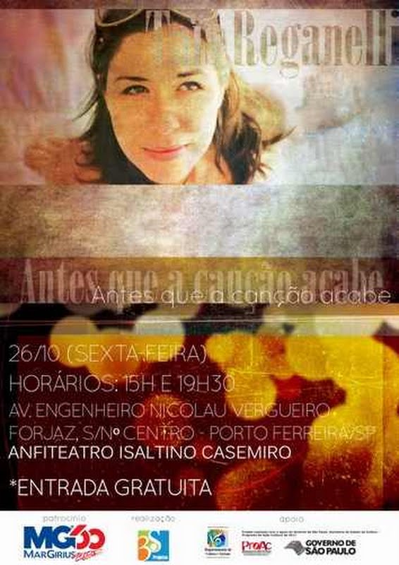 Na sexta-feira, 26 de outubro, a cantora Taïs Reganelli sobe ao palco do Anfiteatro Isaltino Casemiro no Centro Cultural FEPASA para o show “Antes que a canção acabe”. Com entrada gratuita, a apresentação tem início às 19h30 e envolve os sucessos da carreira da cantora e compositora campineira, que acaba de chegar ao Brasil após uma turnê de shows na Europa. Suas canções vêm conquistando o Brasil e o mundo com o melhor da música popular brasileira.