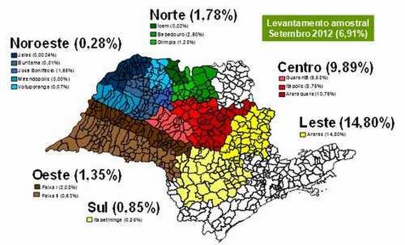 Em todo o parque citrícola, a doença contamina 6,9% das árvores e 64,1% dos talhões. A região central tem 9,9% das plantas contaminadas. A região Norte apresenta 1,8% de árvores com sintomas, a Oeste, 1,3%, a Sul, 0,85% e a Noroeste, 0,28%.