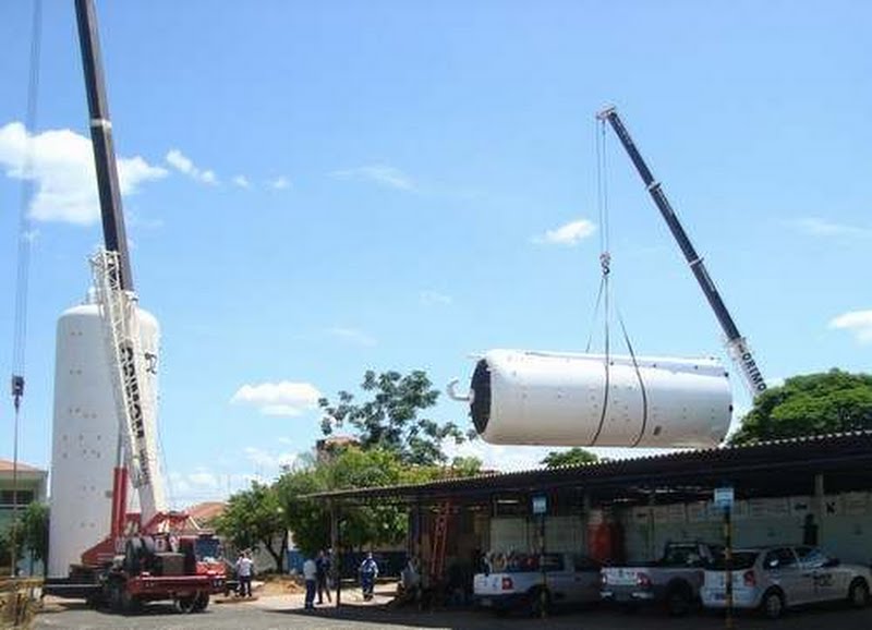 Após a chegada do segundo reservatório, ambos foram içados e posicionados na área da ETA. Para realização deste trabalho foi necessário o uso de dois guindastes, um posicionado dentro da Foz e o outro posicionado na Rua João M. Salgueiro.