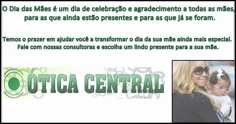 A Ótica Central, lhe ajuda a dar aquele presente tão especial. Nós da Ótica Central, temos o prazer em proporcionar novidades para sua mãe. Já pensou em dar um lindo óculos solar ou uma linda armação receituário, ou até mesmo para as mamães mais fashion aquela lente de contato para inovar o look?