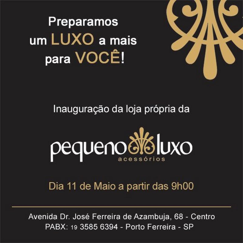 Inauguração de loja própria, Pequeno Luxo e Acessórios à partir das 9:00 localizada na Avenida DR. José Ferreira de Azambuja, nº 68 – Centro de Porto Ferreira – SP.