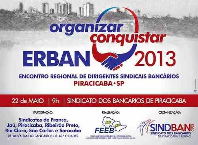 Estarão em Piracicaba participando do Erban – Encontro Regional dos Bancários, dirigentes dos sindicatos de Franca, Jaú, Piracicaba, Rio Claro, São Carlos, Sorocaba e Ribeirão Preto, representando bancários de 167 municípios que fazem parte das bases sindicais.