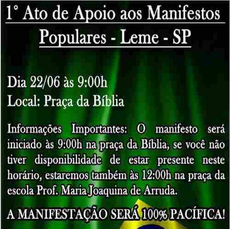 A mobilização que tomou conta de várias cidades do país chega neste sábado (22) a Leme. Nas redes sociais, mais de 2.500 pessoas confirmaram presença no protesto marcado para as 09h00 com saída da Praça da Bíblia, região central da cidade.