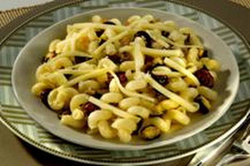 – Escorra a massa, acrescente o azeite, a berinjela, as uvas passas, a azeitona e envolva bem com a ajuda de dois garfos grandes.