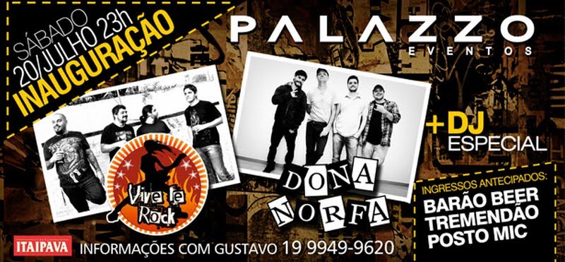 No dia 20 de julho (sábado) o “Palazzo” será inaugurado com show de Vive Le Rock e Dona Norfa + Dj Especial.
