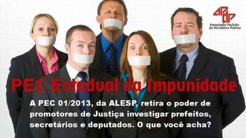 A “PEC Estadual da Impunidade” propõe que só o Procurador-Geral de Justiça possa investigar os prefeitos paulistas, deputados e secretários estaduais, conselheiros dos Tribunais de Contas, dentre outras autoridades, excluindo essa atribuição dos Promotores de Justiça.