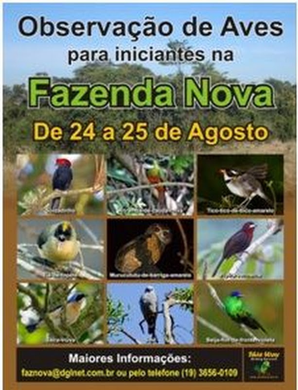 A Fazenda Nova sediará um curso de observação de aves para iniciantes em parceria com a This Way Birding Services nos dias 24 e 25 de agosto. O professor será o biólogo e mestrando em Biologia Animal pela Universidade Estadual de Campinas – Unicamp Carlos Henrique L. Nunes de Almeida . Ele é ornitólogo e herpetólogo. Sua atual linha de pesquisa abrange distribuição geográfica, revisão taxonômica e filogenia de espécies, e seus trabalhos estão publicados em livros e revistas científicas no Brasil e no Exterior.