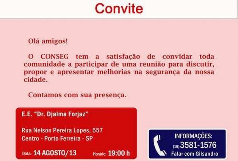 O CONSEG – Conselho Comunitário de Segurança de Porto Ferreira todos os interessados para a reunião sobre Segurança, a qual será realizada no dia 14 de agosto de 2013, a partir das 19h00, na E.E. Dr. Djalma Forjaz, localizada na Rua Nelson Pereira Lopes, 557, Centro.