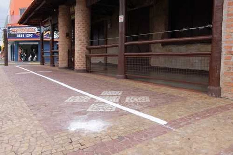 Estão sendo pintadas faixas brancas nas calçadas que possuem no mínimo 2 metros de largura. Em calçadas menores, não serão permitidas mesas e cadeiras. Nas que se encaixam na metragem mínima, a faixa será pintada de modo que o espaço fique dividido em duas partes iguais.
