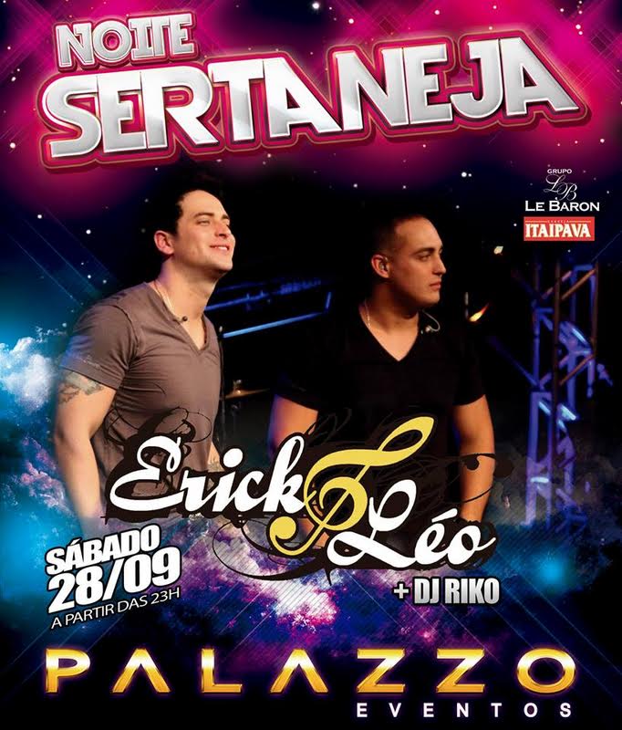 Neste sábado 28 de Setembro dupla Erick & Léo + Dj Ryko na Palazzo Eventos, cerveja double até as 00:00hs.