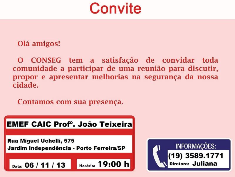 O CONSEG – Conselho Comunitário de Segurança de Porto Ferreira convida todos os interessados para a reunião sobre Segurança, a qual será realizada no dia 06 de novembro de 2013, a partir das 19h00, na EMEF CAIC Profª João Teixeira, localizada na rua Miguel Uchelli, 575, Jardim Independência.