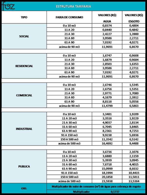 Como previsto no contrato de concessão, o reajuste anual das tarifas de água e esgoto e serviços prestados pela Foz será aplicado em janeiro de 2014. Neste ano, o índice será de 12,6%, conforme deliberado pela Agência Reguladora de Porto Ferreira e pela Prefeitura Municipal. Na fatura de dezembro, os clientes receberão o comunicado sobre os novos valores.