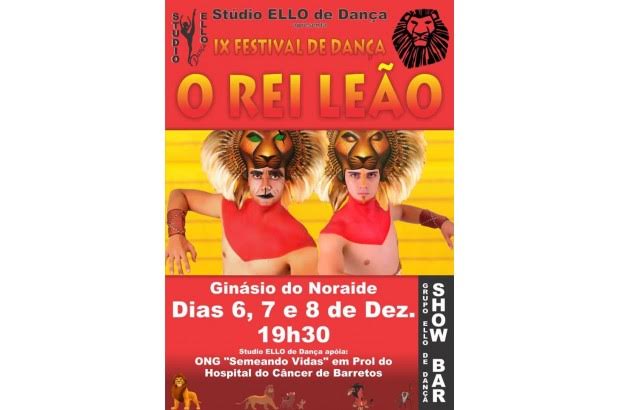 Nos dias 6, 7 e 8 de dezembro, o Ginásio de Esportes “Sylvio Marques Filho”, no Jardim Primavera, receberá cerca de 150 alunos do Studio Ello de Dança, para apresentar “O Rei Leão”, a partir das 19h30. O espetáculo é uma adaptação para o palco de uma famosa produção da Disney.