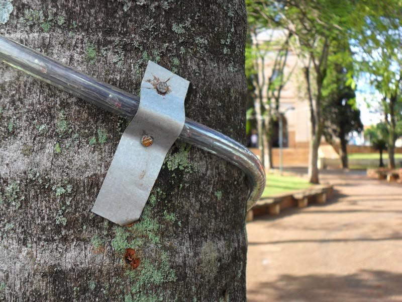 Ocorre que, mais uma vez, as mini lâmpadas estão sendo fixadas nas árvores com a utilização de pregos, conforme mostram as imagens.