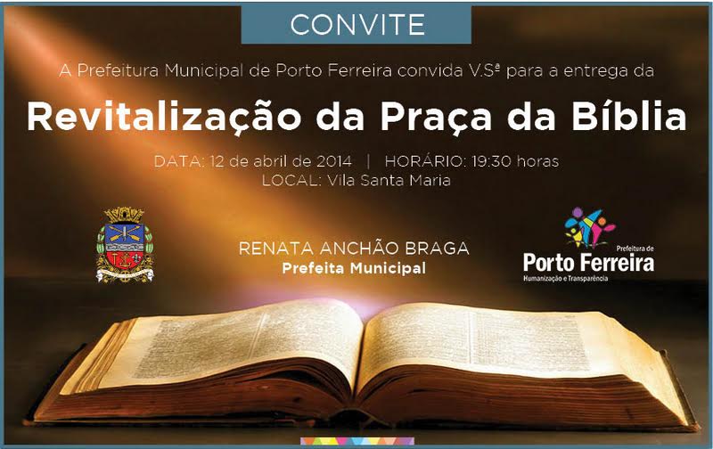 A Prefeitura de Porto Ferreira realizará no próximo sábado, dia 12 de abril, a partir das 19h30, a entrega da Praça da Bíblia revitalizada.