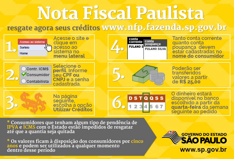 Para saber se você tem valores a receber no programa Nota Fiscal Paulista, basta acessar o site da NFP ( http://www.nfp.fazenda.sp.gov.br/ ) e, no lado esquerdo da tela, informar o número do CPF ou do CNPJ cadastrado. Na página seguinte o contribuinte saberá o valor do crédito a ser resgatado. Confira abaixo o passo a passo para o resgate dos créditos: