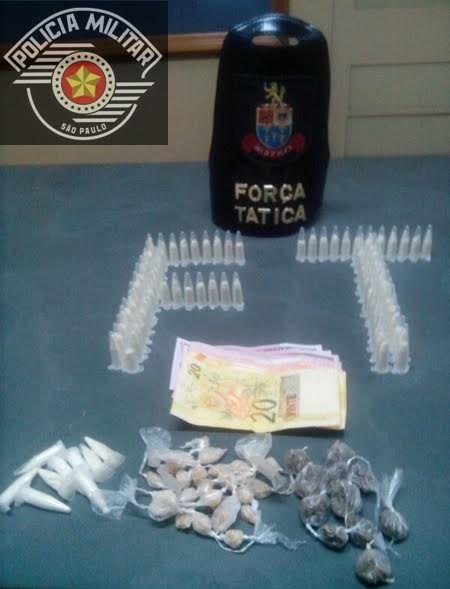 Em vistoria próximo onde ele estava foi localizada também uma sacola plástica contendo em seu interior 27 pedras de crack, 90 pinos com cocaína e 6 trouxinhas com maconha.
